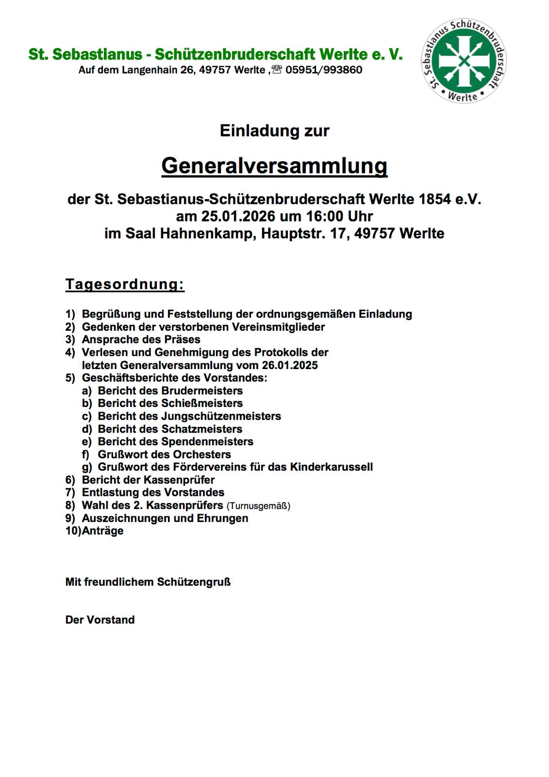 Herzliche Einladung zum Schützenhochamt am 25. Januar um 9.00 Uhr in der St.-Sixtus-Kirche, welches wir anlässlich unseres Patronatsfestes begehen. Am Nachmittag findet die Generalversammlung 2026 im Saal Hahnenkamp statt.